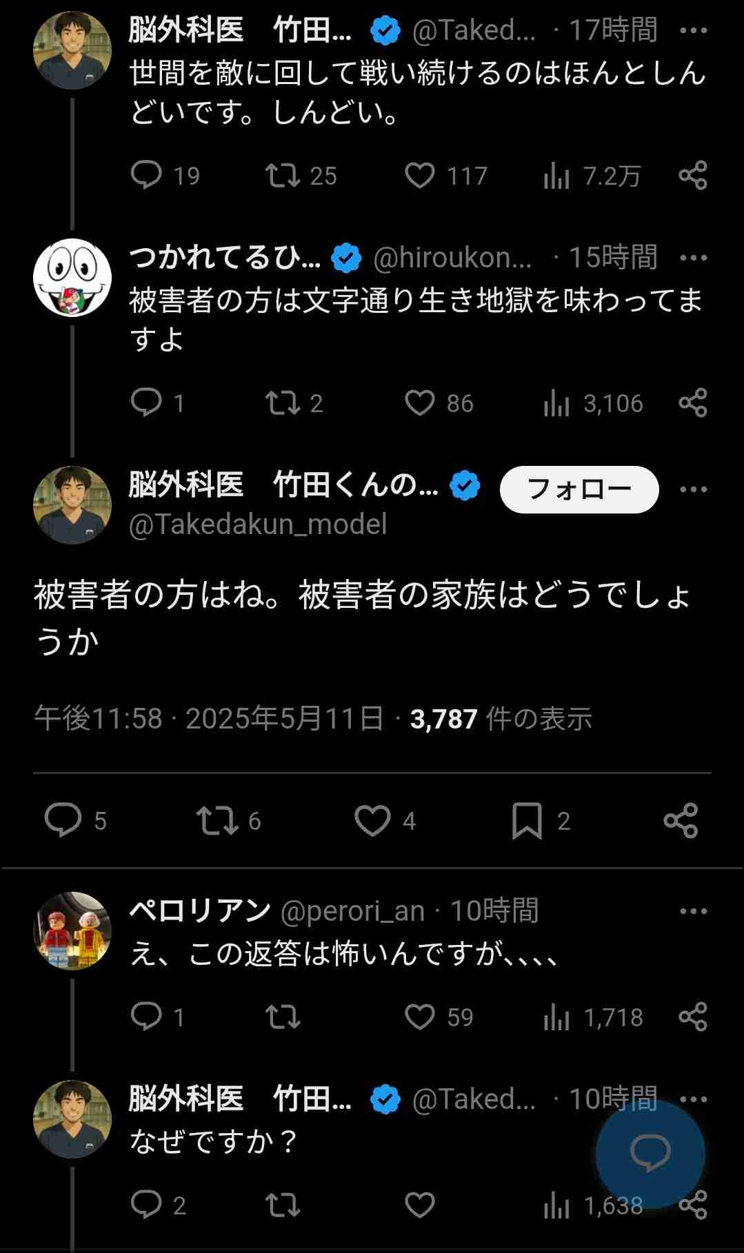 脳外科医竹田くん「誹謗中傷つらお🥲」敵「被害者は文字通り生き地獄を味わってますよ」竹田君「…」