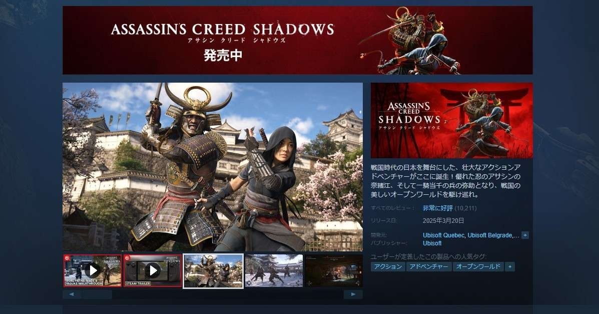 - ゲームメーカー・仏Ubisoftの日本支社であるユービーアイソフト(Ubisoft Japan)は3月25日、新作ゲーム「アサシン クリード シャドウズ」について、プレイヤーに感謝を伝えるメッセージを発表した。複数の配信プラットフォームで高評価を得たことを伝え「皆さまからのご支援と熱意に感動しています」などと述べている。