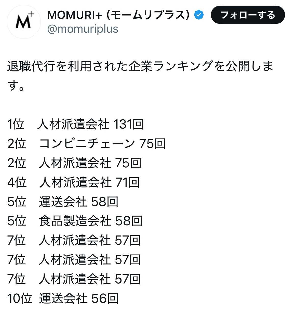 退職代行モームリを利用した企業ランキング、ついに発表されてしまうwww