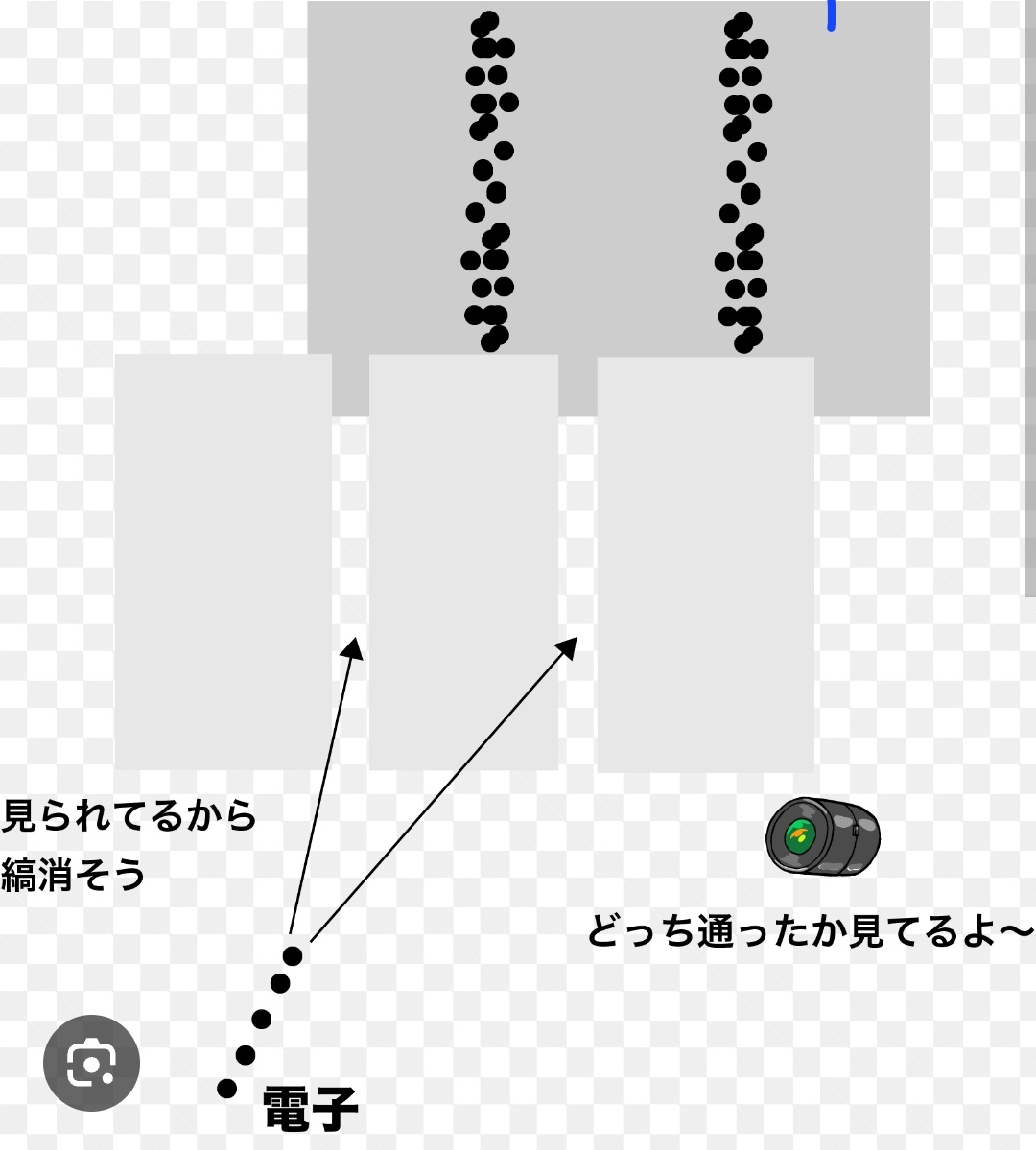 しかし、もし実験者が、どのスリットを粒子が通過したかを観測しようとすると、干渉縞が消えてしまい、粒子は単なる粒子として振る舞うようになります。