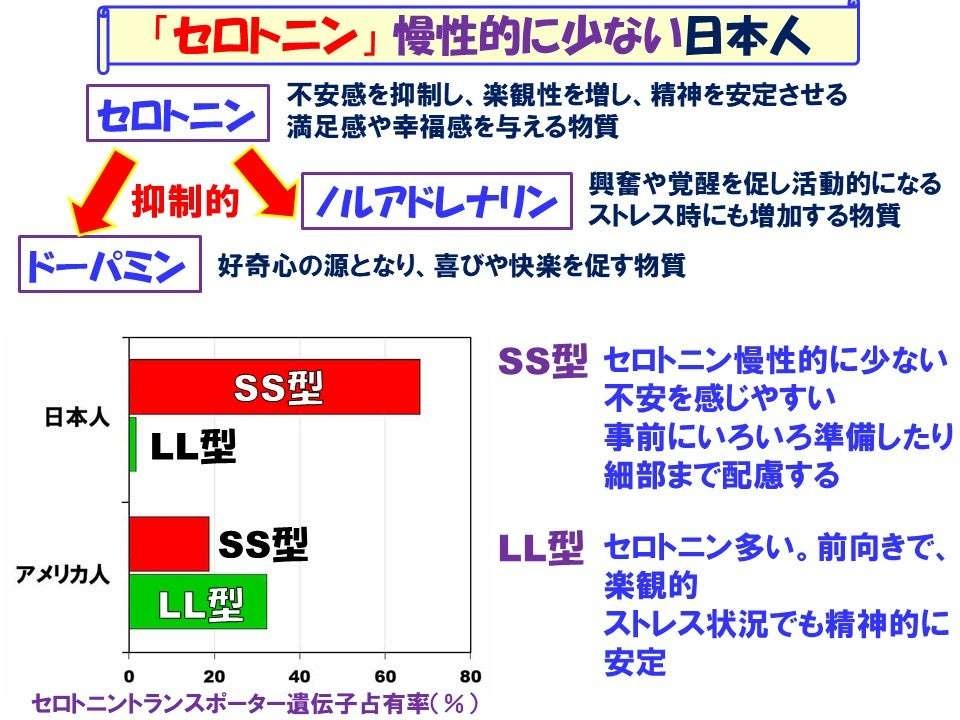その中心にあるものは不安感であり、不安感を直接抑制する主体はセロトニン(ノルアドレナリンやドーパミンの作用を抑制する)といわれる脳内ホルモン(神経伝達物質)が挙げられ、日本人はセロトニンの最も不足しやすい人種であることが知られています。