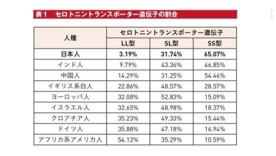 - 不安遺伝子とか言われるSS型の保有率が高いのは事実らしいが、それが協調性にも繋がるって話もあるからな