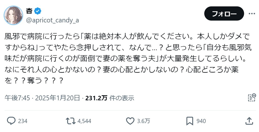 - 薬は本人が飲んでくださいって言われた話と妻の薬を奪う夫の話を混ぜるな