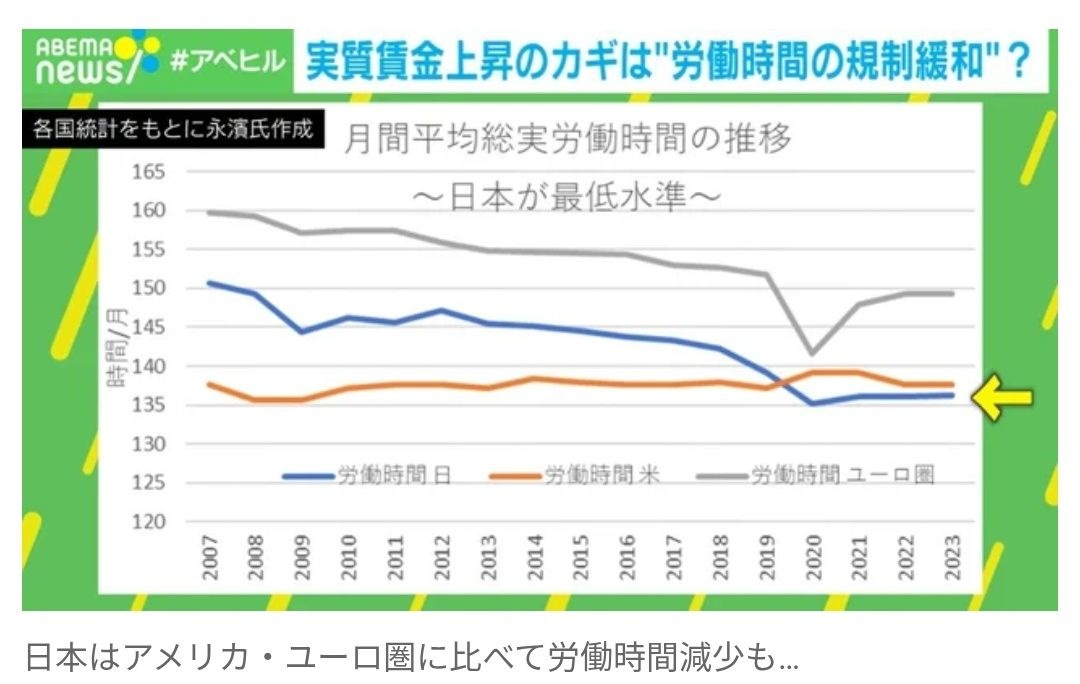第一生命経済研究所の首席エコノミスト・永濱利廣氏は、高市総理誕生の前から、実質賃金上昇に求められる経済政策として労働時間の規制緩和を挙げている。「2007年から足元までのアメリカと日本とヨーロッパの実質賃金の変化率を4つの要因に分解して比較すると、例えば労働分配率だけで比較すると、日本の方がヨーロッパよりも伸びが高いので本来、実質賃金が上がってしかるべきだが、一番その足を引っ張っているのが労働時間の減少」(永濱利廣氏、以下同)