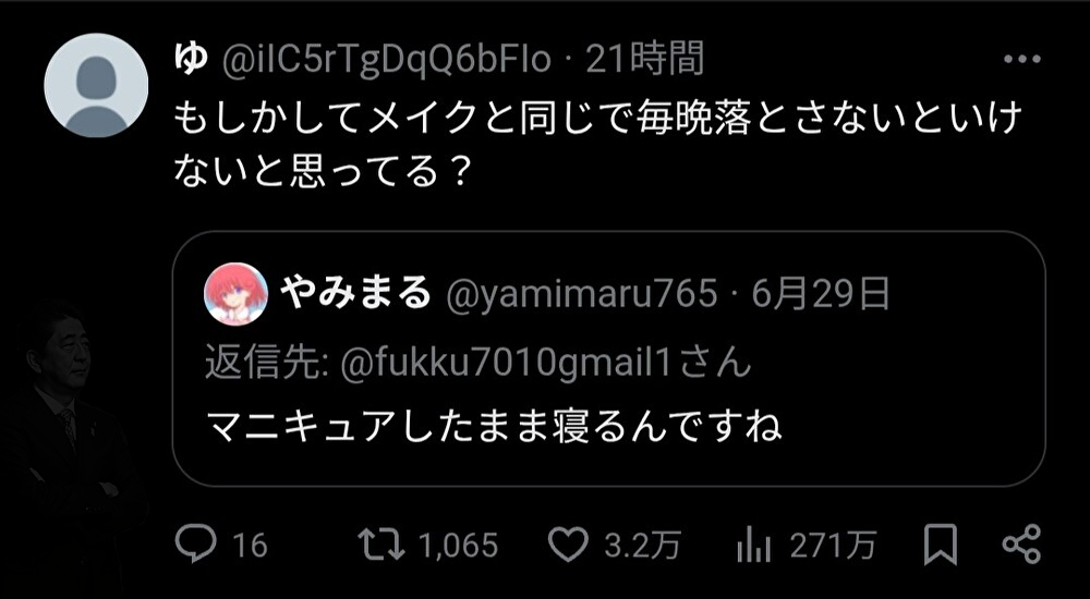 主語なしに「マニキュアしたまま寝るんですね~」って何か嫌味な含みがありそうに思ったらただの無知牛かよみたいな流れになった