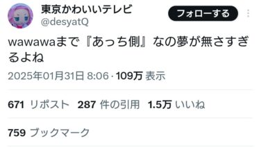 エッヂ 𝕏民「wawawaまで『あっち側』なの夢が無さすぎるよね」→何故か引用でぶっ叩かれてしまうwww
