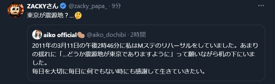 - 今この揺れが最大でありますようにとかならわかるけど震源地が東京でありますようにっていうのがなんか引っ掛かるんよな