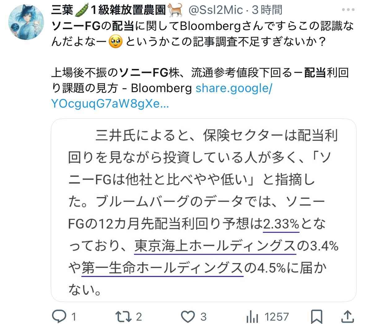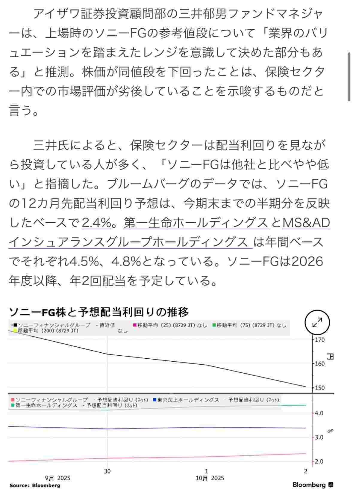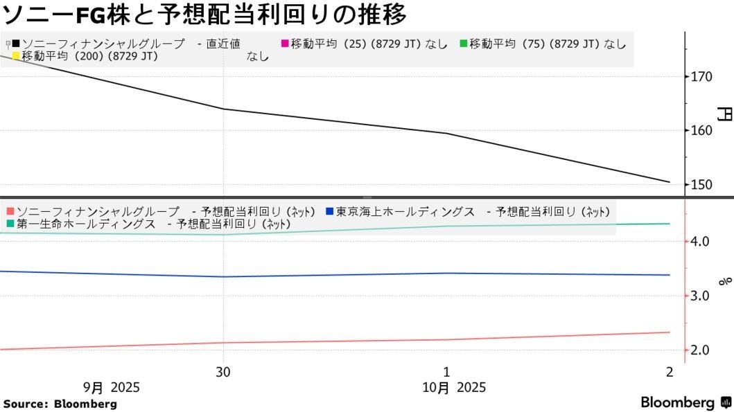 ブルームバーグのデータでは、ソニーFGの12カ月先配当利回り予想は、今期末までの半期分を反映したベースで2.4%。第一生命ホールディングスとMS&ADインシュアランスグループホールディングスは年間ベースでそれぞれ4.5%、4.8%となっている。ソニーFGは2026年度以降、年2回配当を予定している。 - 3 : 2025/10/02(木) 22:34:41.84 ID:Un+WHzin0
