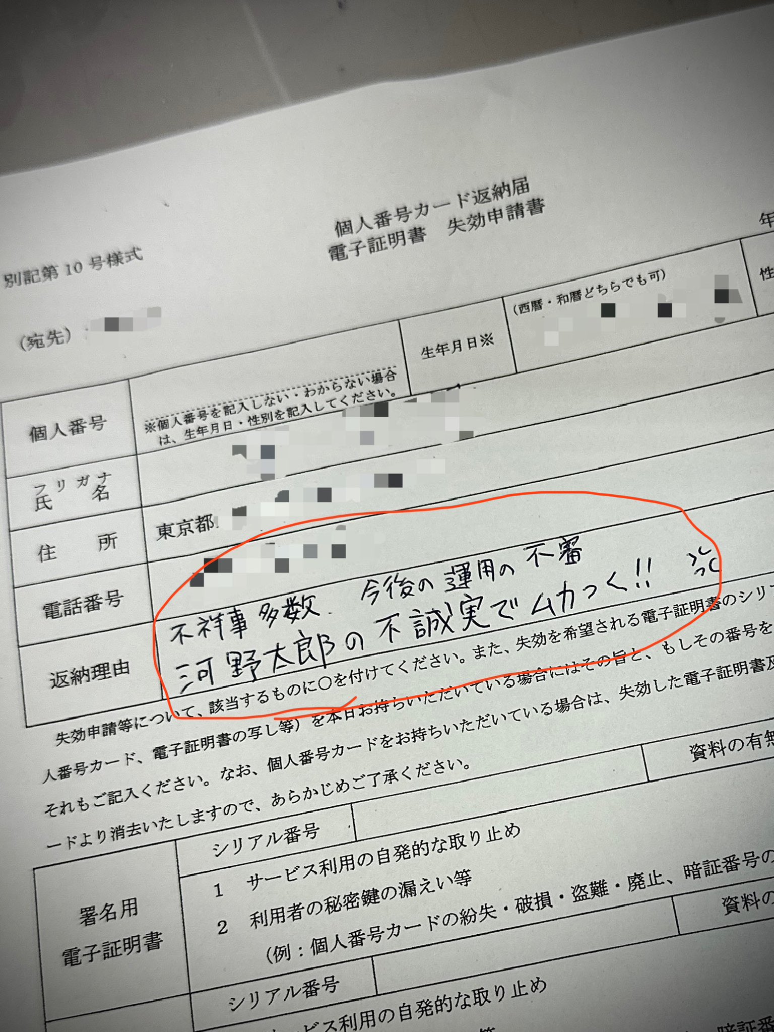 >失効した電子証明書及びその鍵ペアを当該個人番号カードより消去いたしますので、あらかじめご了承ください。