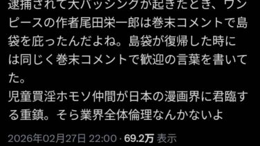 嫌儲 尾田栄一郎さん、女子高生とセクロスした漫画家を擁護し大炎上中www
