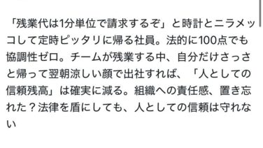 嫌儲 弁護士「定時ピッタリに帰る社員。法的に100点でも協調性は0。人としての信頼残高が確実に減ってます」