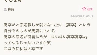 エッヂ 大卒、高卒を煽りまくる「高卒底辺が何言おうが『はいはい高卒高卒w』ってなるでしょ笑」