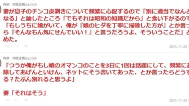 嫌儲 【高市】 可愛い奥様「子供(男)のチ●コは皮を剥いてちゃんと洗うべき」と主張し、夫と喧嘩になる