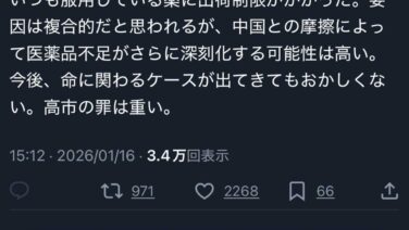嫌儲 病院の処方薬本日より出荷制限が発動した模様、中国の高市制裁で日本の医療崩壊へ