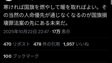 嫌儲 【正論】有識者「いざ寒さに耐えきれず日本国旗を焼いて暖を取ろう、そんな事さえ許されなくなる未来が正しいですか?」