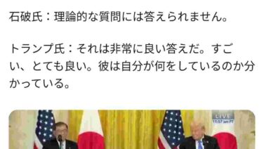 エッヂ 石破「仮定の質問にはお答えできない」通訳「theoretical question(理論的な質問)にはお答えできない」記者「www(爆笑)」トランプ「とてもいい答えだ(苦笑い)」石破「😃」