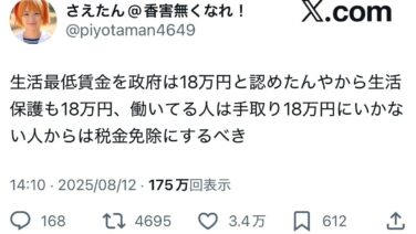 嫌儲 生活保護「最低賃金18万と決めたんだから生活保護は18万にすべき」3.4万いいね