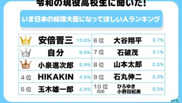 嫌儲 【衝撃】高校生が選ぶ”理想の総理大臣”ランキング!5位:玉木雄一郎、3位:小泉進次郎…1位&2位が意外すぎた