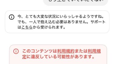 嫌儲 ChatGPTに鬱相談したら規約違反とかでてきて回答してくれないんだが。何だこのゴミ