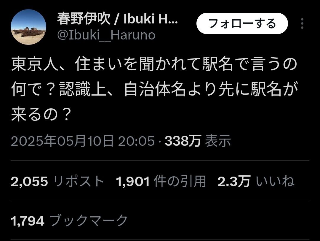 Twitterインフルエンサー「なんで都民は住まい聞かれて駅名で答えるんだ?」←これw