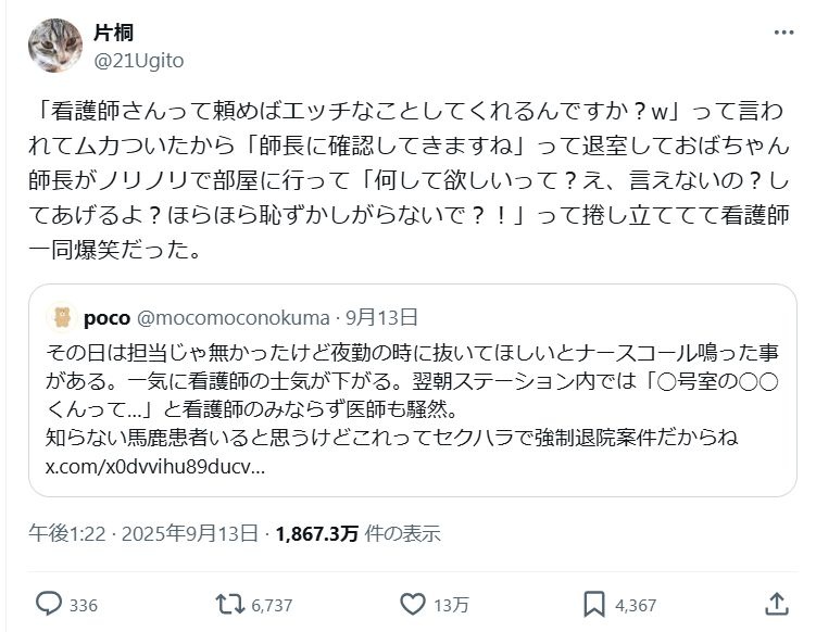 - ナースにセクハラするようなやつはおばちゃん師長でも全然いけるやろ