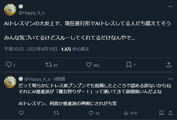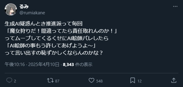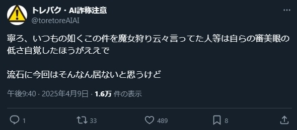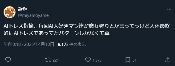X民、気付く「AIトレス指摘、あってたパターンしかなくて草」「AI絵師擁護するやつ審美眼ない」