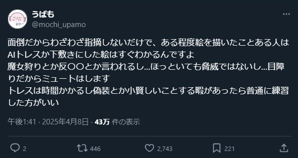 AI公言してるのにめっちゃいいね付く人居るんだからそっちを目指せばいい - 27 : 2025/04/11(金) 10:54:42.372 ID:Td8e1kCc0