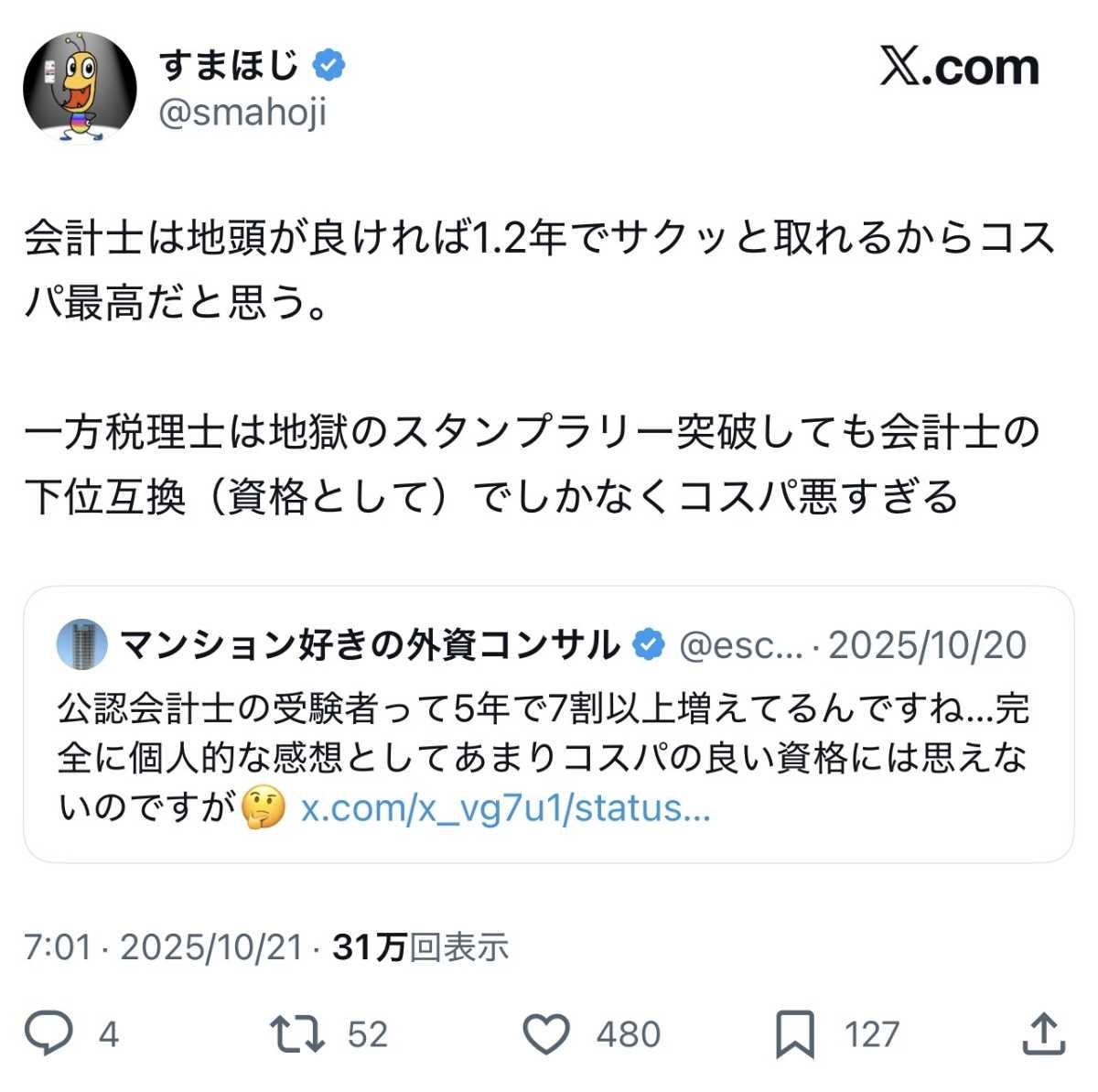 X民「会計士は1.2年でサクッと取れるからコスパ最強。税理士試験は地獄なのに会計士の下位互換資格でコスパ悪すぎ」