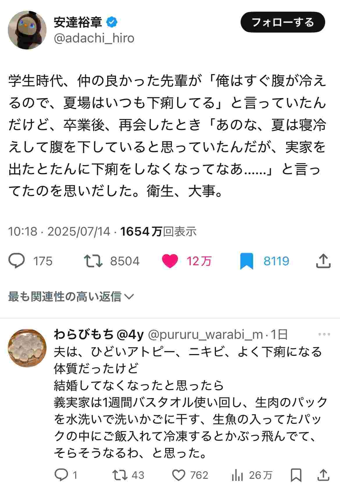 X民「夏場は腹が冷えるから腹下すと言ってる友達が実家を出たら治った」衝撃の理由が明らかに…!