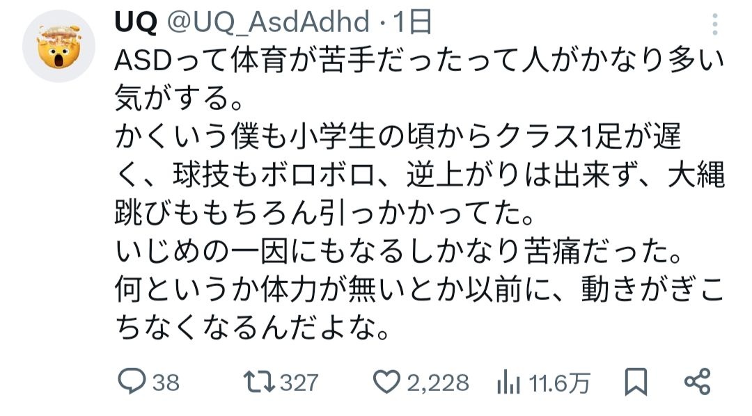 X民「ASDって体育苦手だった人が多い気がする。体力が無いとか以前に動きがぎこちなくなるんだよな。」